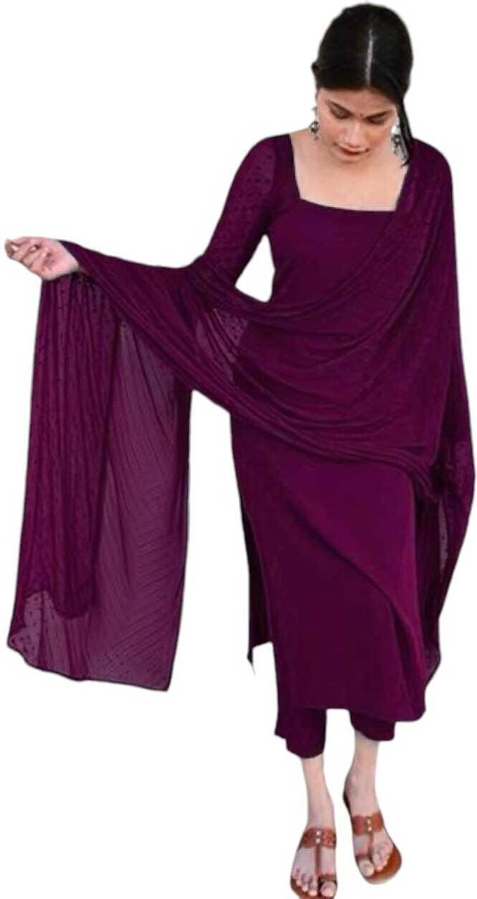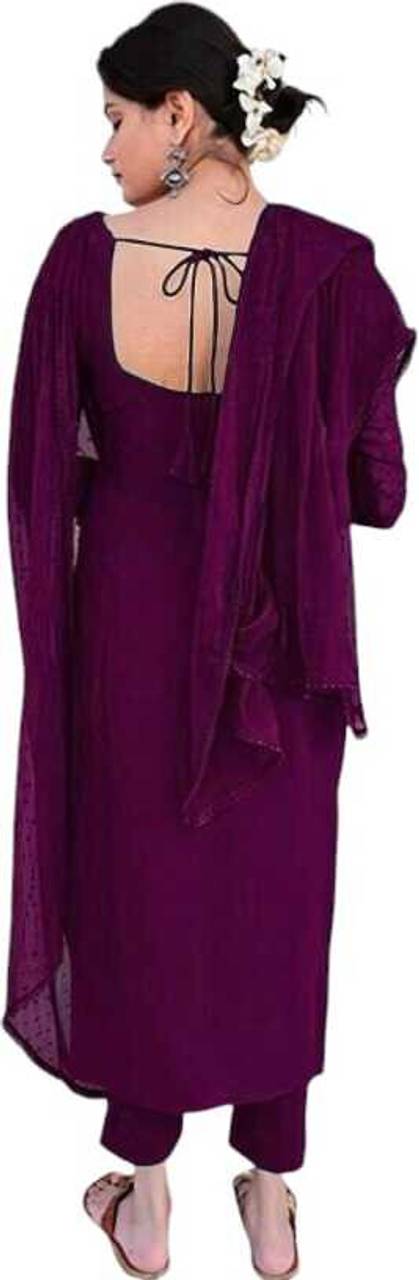 The HouseOfCommon ethnic set includes a purple kurta, churidar, and dupatta, all made from a comfortable cotton blend fabric. The set is designed for festive and party occasions and features a solid floral print. The top is an A-line kurta with a U-neck and 3/4 regular sleeves, while the bottom is a churidar. The outfit is ideal for women, with the kurta having a knee-length cut and no additional ornamentation or surface styling. The fabric is soft cotton for both the top and bottom, with cotton lining for added comfort. The set comes in a size S Regular, and the model, who is 5.5ft tall, is wearing a size M. The garment should be gently hand washed for care. The colorful dupatta completes the ensemble, adding a festive touch.